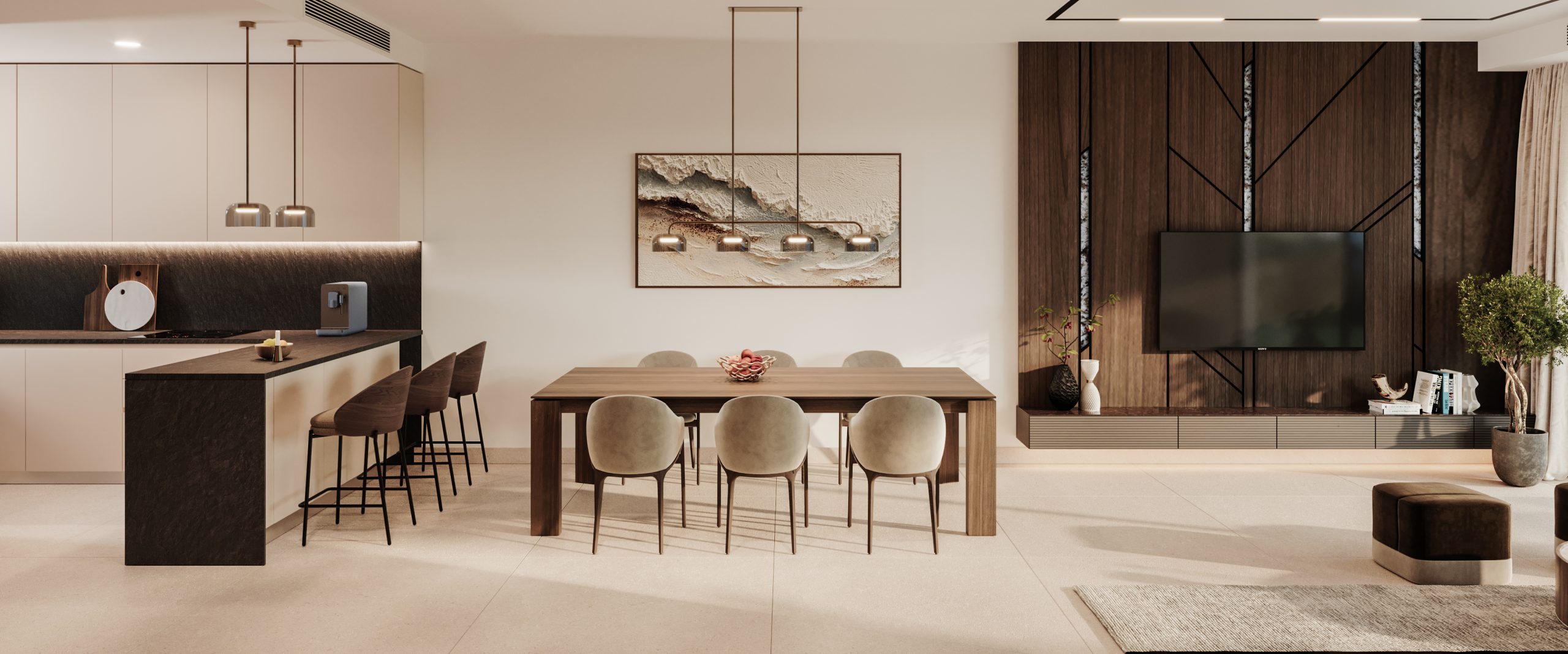 Интерьеры выполнены в современном, вневременном стиле с использованием высококачественных материалов, таких как крупноформатная итальянская плитка, натуральный шпон и бытовая техника Siemens. Большое остекление обеспечивает прекрасное освещение и бесшовную связь между интерьером и террасами и садом.
